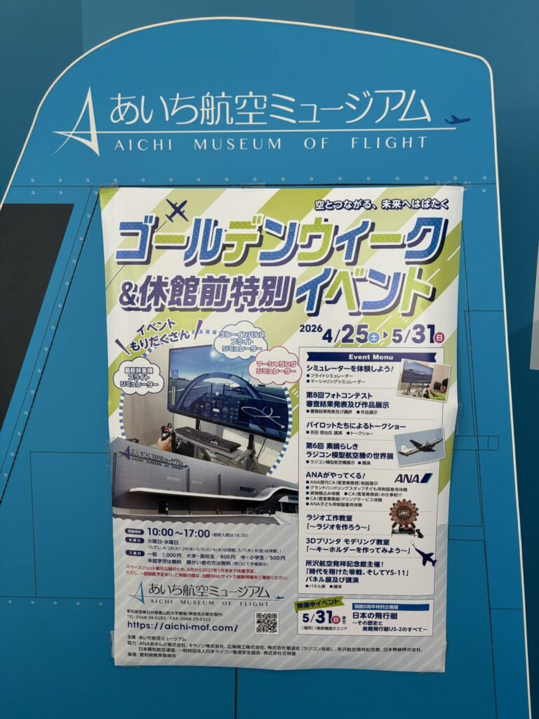 こんばんわー!みなさんはGW休みはいつからですか?あいち航空ミュージアムでは一足先にゴールデンウィークとそしてまもなく休館に入るということで4月25日から特別イベントが開催しております!!