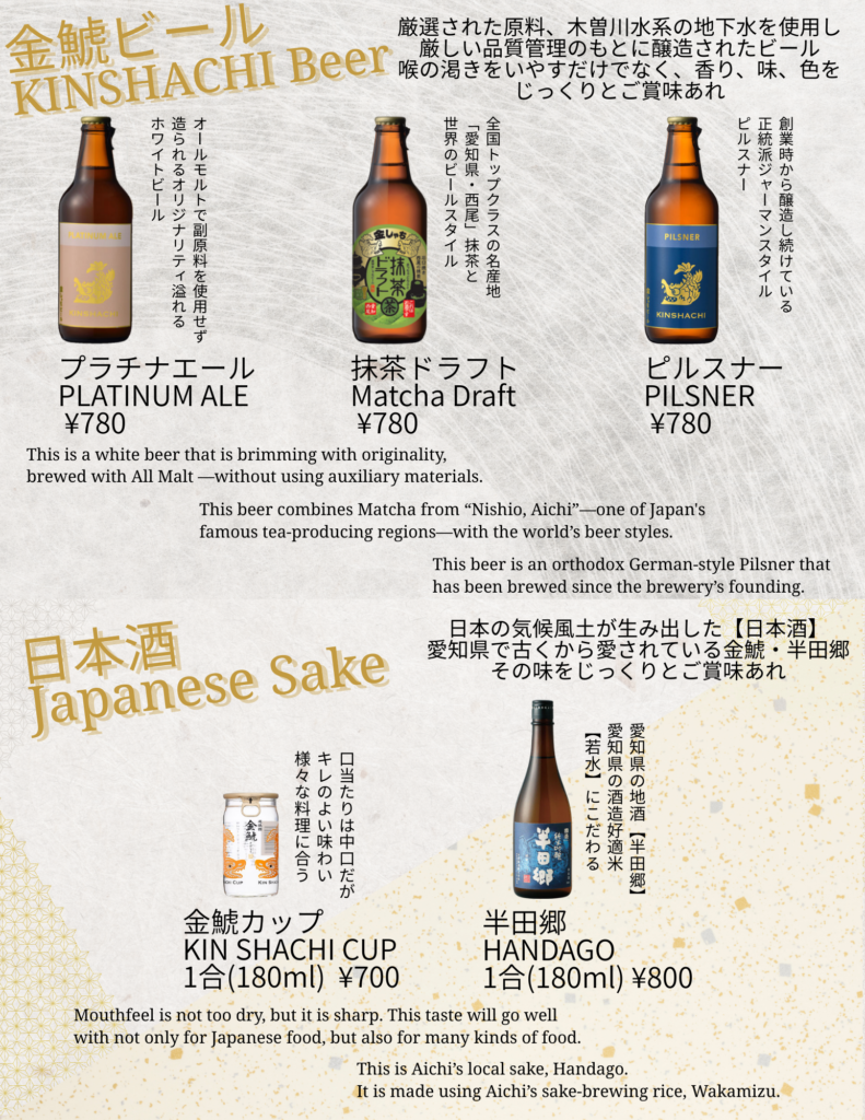 【金鯱ビール】は名古屋の地で生まれた、伝統と革新を融合させたクラフトビールです。名古屋を象徴する「しゃちほこ」のデザインがラベルにあしらわれおり、日本のビール文化を創造するという想いが込められています。