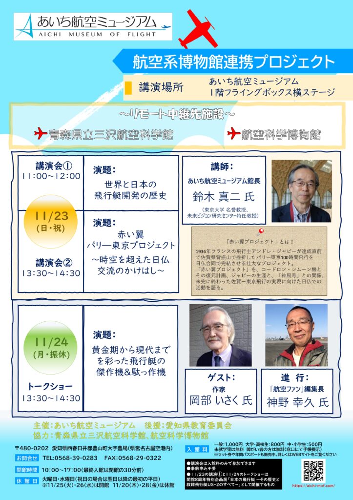 あいち航空ミュージアムでは、「航空系博物館連携プロジェクト」として、当館で行う講演会及びトークショーを航空系博物館と連携してリモート中継します。今回は青森県立三沢航空科学館と航空科学博物館が中継先施設になります。